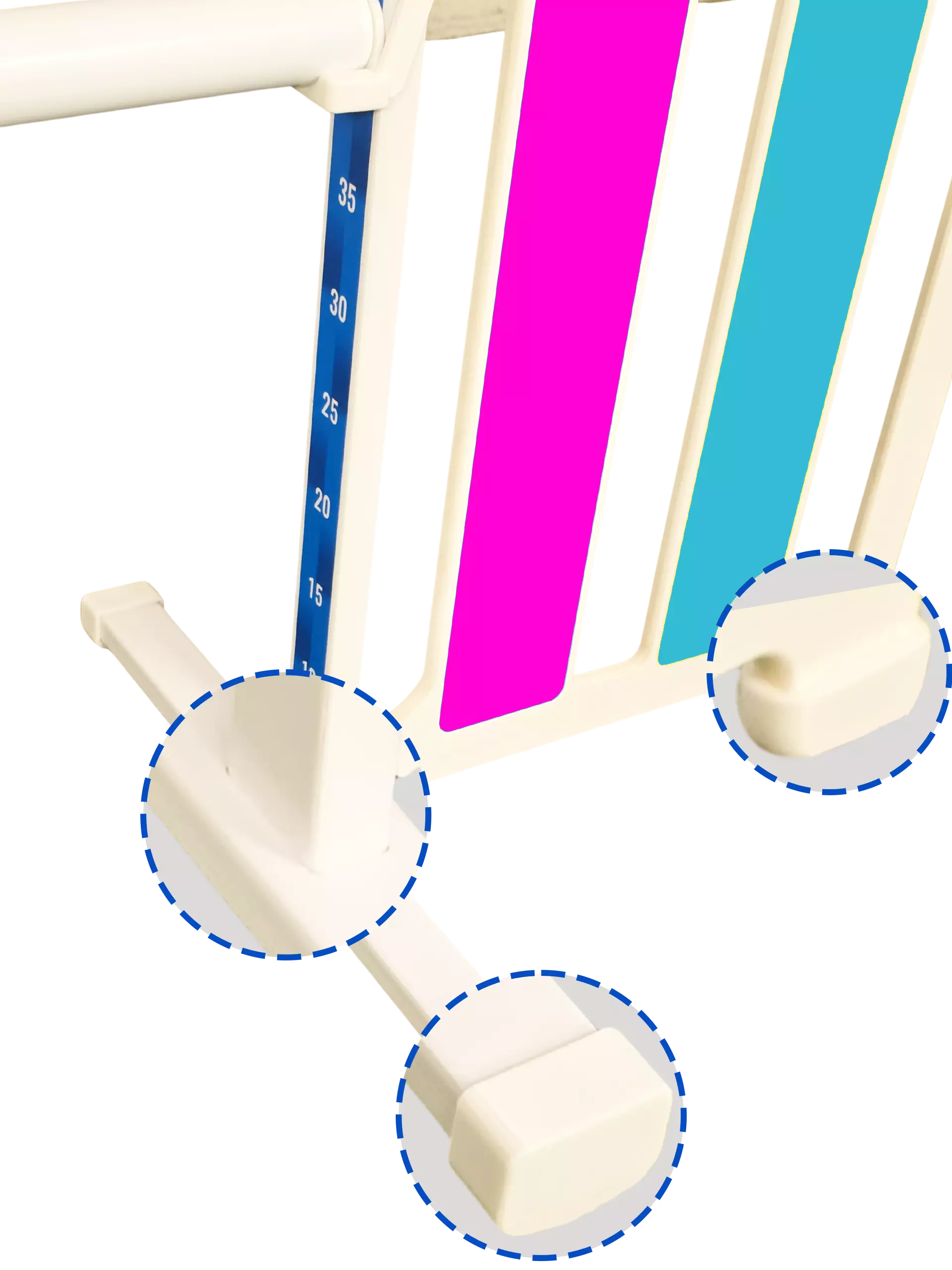 Direct Height Reading: The Rigid-Core PVC upright features a high-contrast numerical scale (range from 10 cm to 65 cm). This scale allows judges or ring party staff to perform height changes in seconds with competition-grade precision, eliminating manual measurement errors.